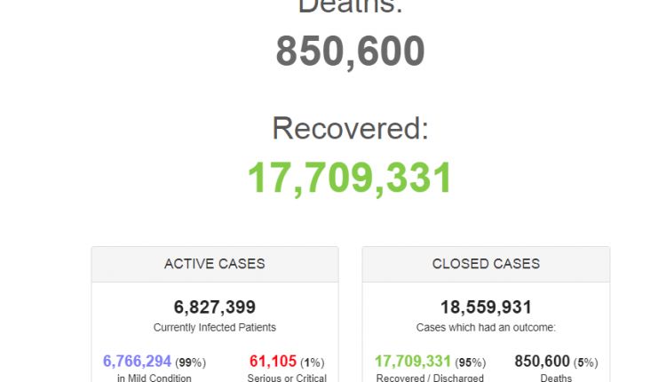Addunyaarratti lakkoofsi namoota Vaayrasii koroonaan du’anii kuma dhibba 8 fi kuma 50 caale