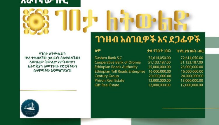 Haaluma kanaan, Baankiin Hojii Gamtaa Oromiyaa Birri miiliyoona 51 fi luma 133 fi 187, Baankiin Daashan Birri miiliyoona 72 fi kuma 614 fi 50, Abbaan Taayitaa Daandiiwwanii Birrii miiliyoona 25, Intarpiraayiziin Daandii Kaffaltii Ityoophiyaa Birrii miiliyoona 16 deeggarsa taasisuu beeksiseera.
