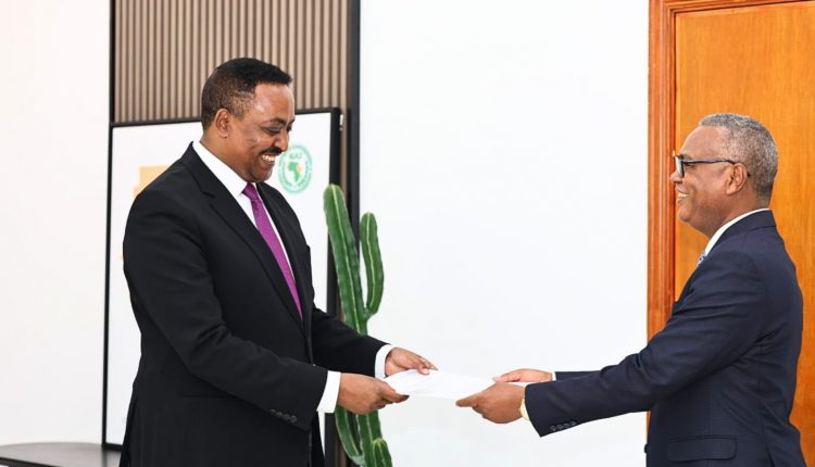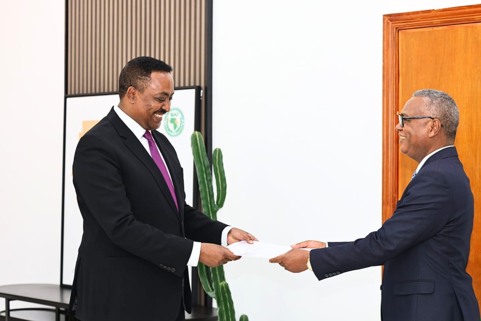 Finfinnee, Sadaasa 14, 2018(FMC)- Jibuutiitti Ambaasaaddarri Itiyoophiyaa Dooktar Ambaasaaddar Laggasaa Tulluun xalayaa muudama isaanii Barreessaa Olaanaa Abbaa Taayitaa Misoomaa Mootummoota Baha Afrikaa (IGAD) Dooktar Warqinaa Gabayyoof dhiyeessan.