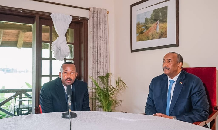 Dura taa’aan  Mana Maree Ce’umsaa Birmadummaa Sudaan Leetenaal Jeneraal Abdulfattaa Al Burhaan gamasaaniin, Muummee Ministiraa Abiy Ahimad waliin akka obboleessaatti waliin mari’achuun waldhabdee biyyoota lamaan gidduu jiru karaa nagaan furuuf waliigaluu kaasaniiru.