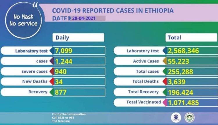 Finfinnee, Eebila 20, 2013 (FBC) – Gabaasa qorannoo sa’aatii 24 darbeetiin namoonni dabalataa 1,244 vaayrasii koroonaan yoo qabaman, lubbuun namoota 34 darbeera.