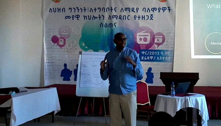 Dooktar Geetaachaw Dinquun bulchiinsa magaalaa Dirree Dawaatti leenjii ogeeyyii miidiyaa fi Koominiikeshinii qophaa’erratti damichaan barnoota laataniiru.