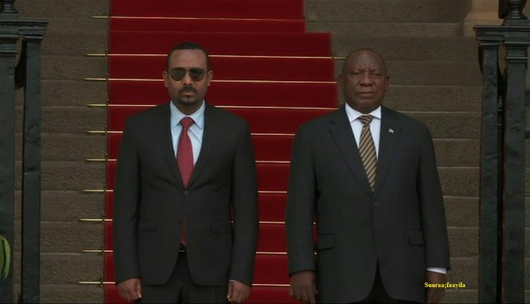 Finfinnee, Bitootessa 23, 2012 (FBC) – Muummee ministiraa Dooktar Abiy Ahimad preezdaantii Afrikaa Kibbaa Siriil Raamaafoosaa waliin mari’atan.