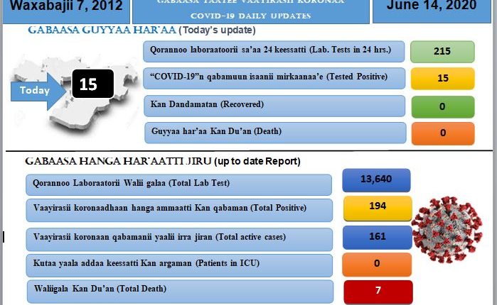Finfinnee, Waxabajjii 7, 2012 (FBC) –Naannoo Oromiyaatti qorannaa sa’aa 24 darbeetin namoota 15 irratti vaayrasiin koroonaa argamuu Biiroon Eeggumsa Fayyaa naannoo Oromiyaa beeksise.