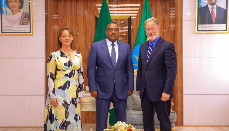 Finfinnee, Waxabajjii 8, 2014 (FBC) – Ittaanaa Muummee Ministiraa fi Ministirri Dhimma Alaa Obbo Dammaqa Mokonniin, Daayrektara Sagantaa Nyaata Addunyaa Deeviid Biyesle fi Ministira Walta’iinsa Idil Addunyaa Siwiidiin Matildaa Erkiraansi waliin mari’ataniiru.