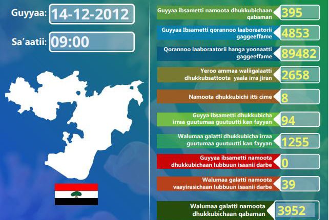 Naannichaatti sa’aa 24 darbeetiin qorannoo laabraatoorii namoota 4853 hojjetameen vaayrasichi namoota 395 irratti argamuu Biiroon Eeggumsa Fayyaa Oromiyaa beeksiseera.