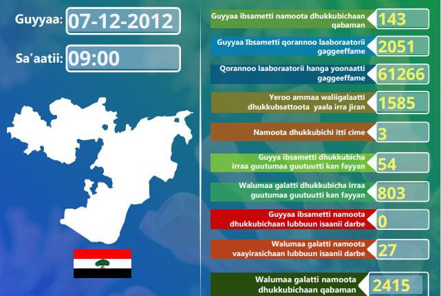 Naannichaatti sa’aa 24 darbeetiin qorannoo laabraatoorii namoota 2051 hojjetameen vaayrasichi namoota 143 irratti argamuu Biiroon Eeggumsa Fayyaa Oromiyaa beeksiseera.