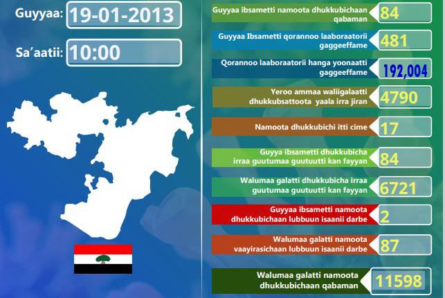 Finfinnee, Fulbaana 19, 2013 (FBC)- Naannoo Oromiyaatti gabaasa qorannoo sa’aa 24 darbeetiin namoonni 84 vaayrasii koroonaan qabamuu ibsame.