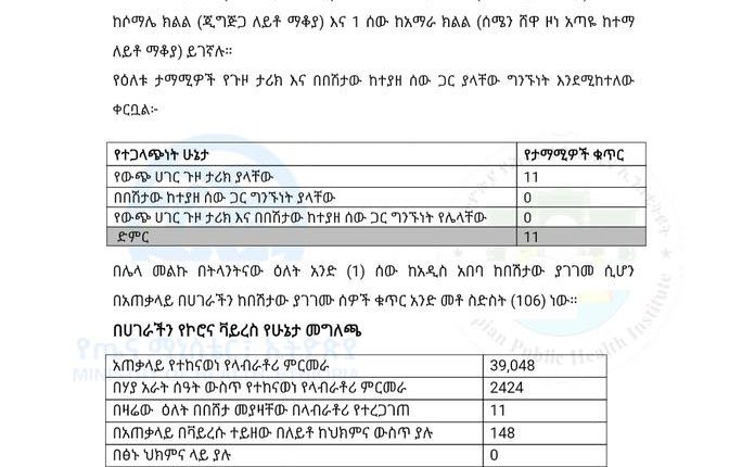 Finfinnee, Caamsaa 4, 2012 (FBC) – Qorannaa sa’aa 24 darbe keessa gaggeeffameen, namoota 11 irratti vaayrasiin koroonaa argame.