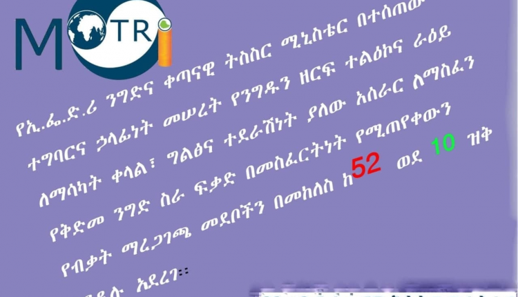 Finfinnee, Sadaasa 10, 2014 (FBC) – Ulaagaaleen mirkaneessa ga’umsa daldala dura 52 turan gara 10tti gadi bu’uu Ministeerri Daldalaa fi Walitti hidhamiinsa Naannawaa beeksise.