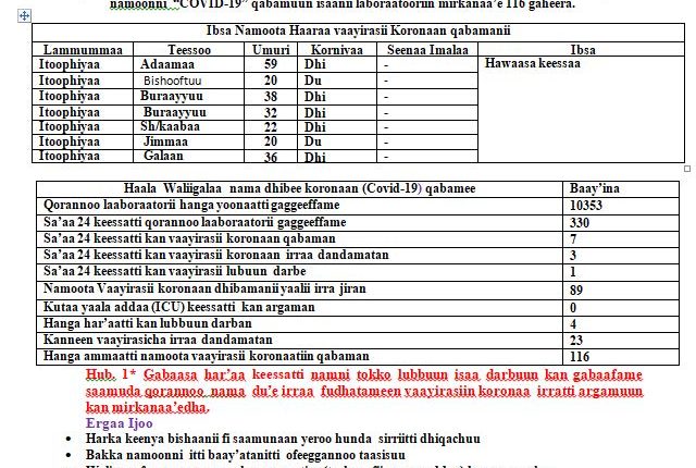 Waliigala naannoo Oromiyaatti lakkoofsi namoota Covid -19 qabamanii 116 ga’eera.