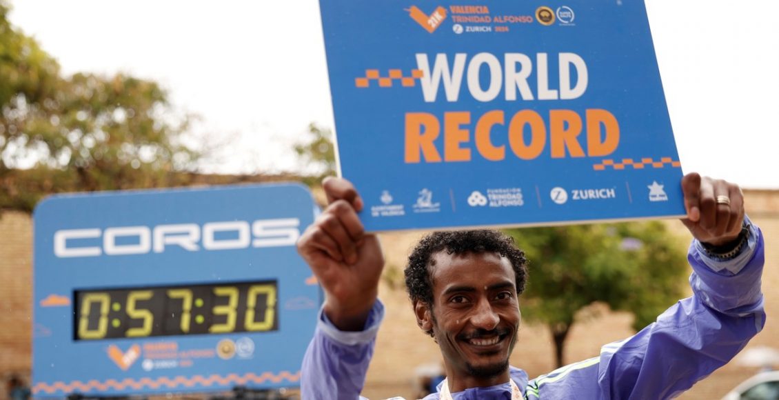 حطم العداء الإثيوبي يوميف كيجلشا الرقم القياسي العالمي لسباق نصف الماراثون للرجال في فالنسيا يوم الأحد، محققا زمنا قدره 57 دقيقة و30 ثانية، بفارق ثانية واحدة عن الرقم السابق.