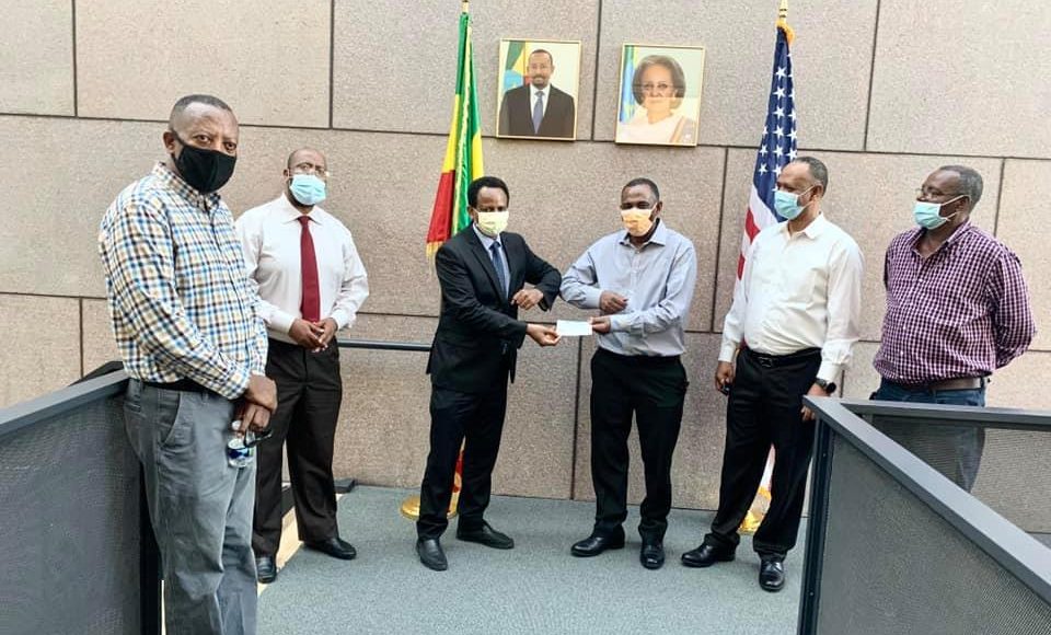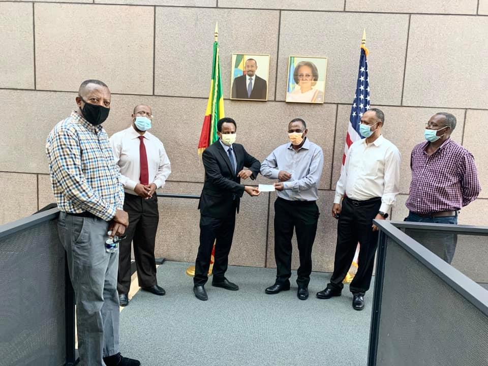 حيث قام أعضاء الجالية بتسليم المبلغ التي تم جمعه من مجتمع الجالية إلى السفير الإثيوبي فوق العادة لدى الولايات المتحدة فصوم أرغا في مقر السفارة.