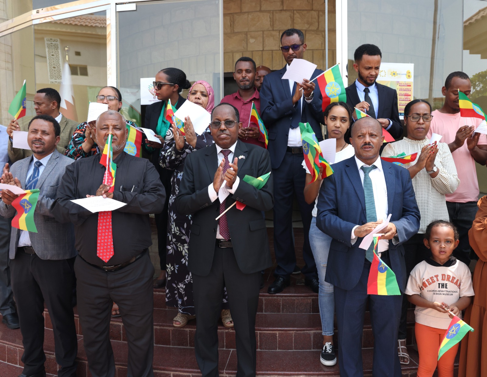 وبهذه المناسبة، قام الدبلوماسيين وموظفي السفارة بالوقوف أمام العلم الإثيوبي، وترديد عبارات شكر وتقدير للأجهزة العسكرية والأمنية والمعلوماتية في إثيوبيا، على التضحيات المقدمة في سبيل الوطن.