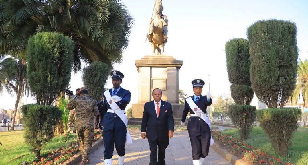 وكجزء من مراسم الاحتفال، وضع رئيس الجمهورية تايي أتسقى سيلاسي وعدد من المسؤولين الحكوميين والعسكريين أكاليل من الزهور على تمثال الإمبراطور منليك الثاني، القائد الذي قاد القوات الإثيوبية إلى انتصار تاريخي على الجيش الإيطالي في 1 مارس 1896، مما حافظ على سيادة إثيوبيا وجعلها رمزًا للنضال ضد الاستعمار في أفريقيا.
