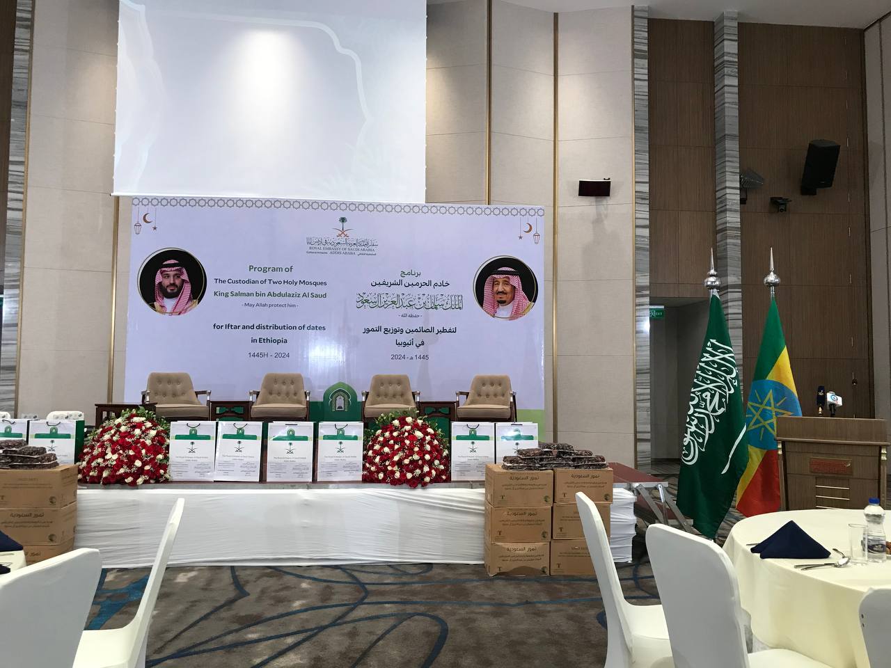دشنت وزارة الشؤون الإسلامية والدعوة والإرشاد ممثلة بالملحقية الثقافية بسفارة المملكة العربية السعودية في إثيوبيا، الأربعاء، برنامجي هدية خادم الحرمين لتفطير الصائمين وتوزيع لهذا العام 1445هـ، وذلك خلال حفل الإفطار السنوي الذي أقيم في فندق سكاي لايت بالعاصمة أديس أبابا.