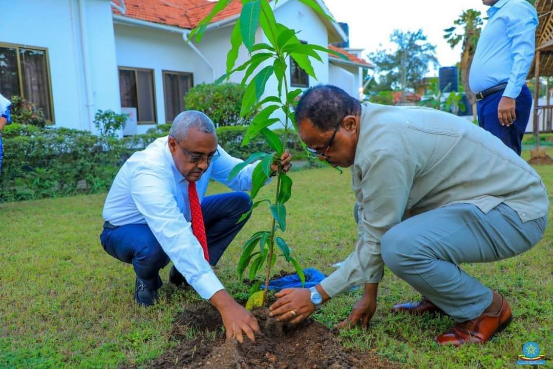 وضع نائب رئيس الوزراء، وزير الخارجية الإثيوبية، دمقى مكونن بصمته الخضراء بزراعة الشتلات في مقر السفارة الأثيوبية، بالعاصمة التنزانية دار السلام.