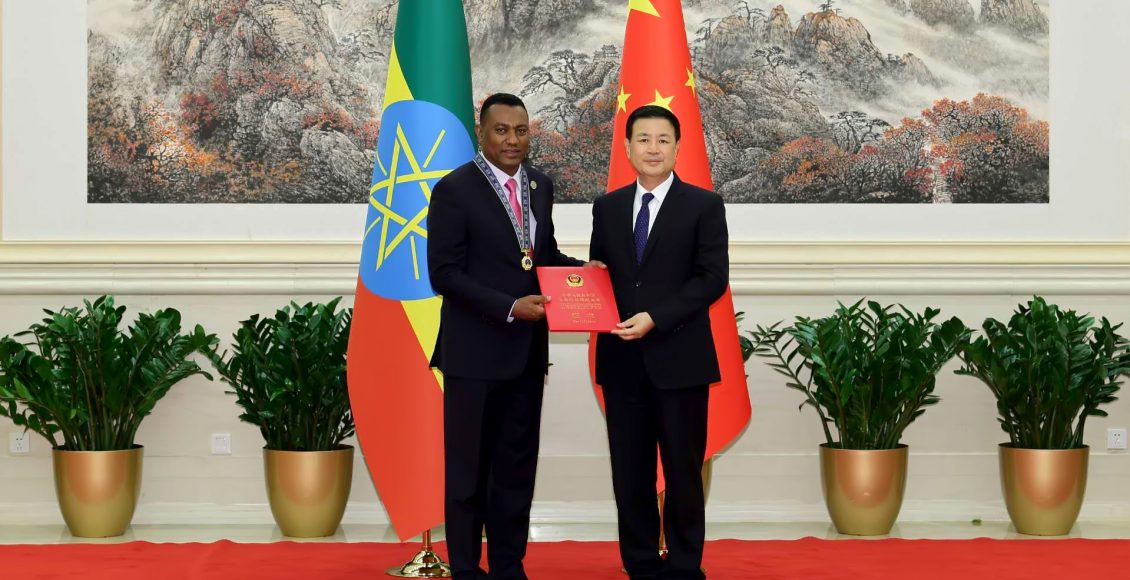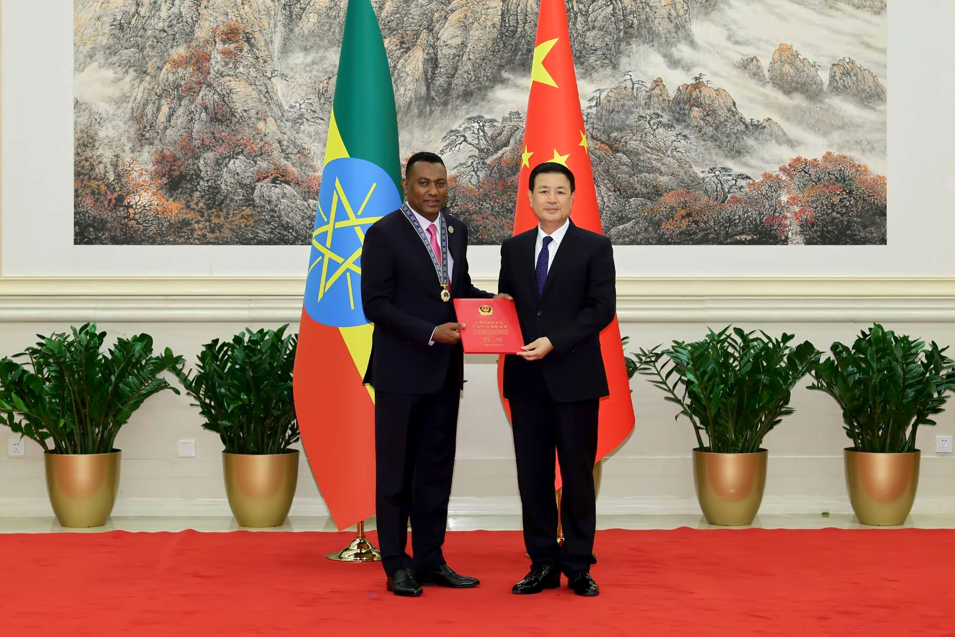 تسلم مفوض الشرطة الفيدرالية الإثيوبية الجنرال دملاش غبرميكائيل، ميدالية سور الصين العظيم التذكارية من عضو مجلس الدولة ووزير الأمن العام الصيني وانغ شياو هونغ، خلال زيارته الرسمية للعاصمة الصينية بكين.