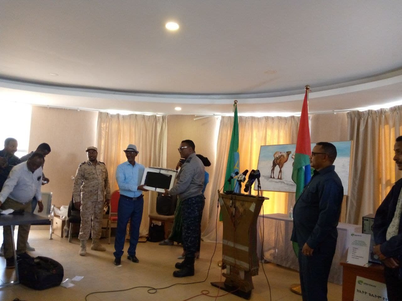 ድጋፉን የፌደራል ፖሊስ ኮሚሽነር ጀኔራል ደመላሽ ገ/ሚካኤል፣ የአዲስ አበባ ፖሊስ ኮሚሽነር ጌቱ አርጋው እና የኢትዮ ቴሌኮም ዋና ስራ አስፈፃሚ ፍሬህይወት ታምሩ በአፋር ክልል ተገኝተው÷ ለክልሉ ርዕሰ መስተዳድር አቶ አወል አርባ አስረክበዋል፡፡