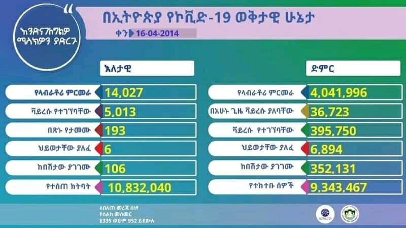 ሚኒስቴሩ ባወጣው ዕለታዊ መረጃ በ24 ሰዓት ውስጥ 14 ሺህ 27 የላቦራቶሪ ምርመራ ተደርጎ 5 ሺህ 13 ሰዎች በኮሮና ቫይረስ መያዛቸውን አስታውቋል፡፡
