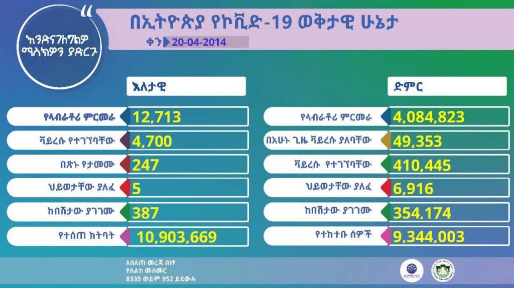 አዲስ አበባ፣ ታህሳስ 20፣ 2014 (ኤፍ ቢ ሲ) በኢትዮጵያ ባለፉት 24 ሰዓታት ለ12 ሺህ 713 ዜጎች በተደረገ የላቦራቶሪ ምርመራ 4 ሺህ 700 ሰዎች የኮሮና ቫይረስ እንደተገኘባቸው የጤና ሚኒስቴር አስታውቋል፡፡