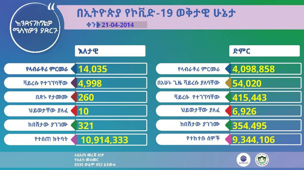 አዲስ አበባ፣ ታህሳስ 21፣ 2014 (ኤፍ ቢ ሲ) ባለፉት 24 ሰአታት ለ14 ሺህ 35 ሰዎች የላቦራቶሪ ምርመራ ተደርጎ 4 ሺህ 998 ሰዎች ኮሮና ቫይረስ እንደተገኘባቸው ጤና ሚኒስቴር አስታወቀ።