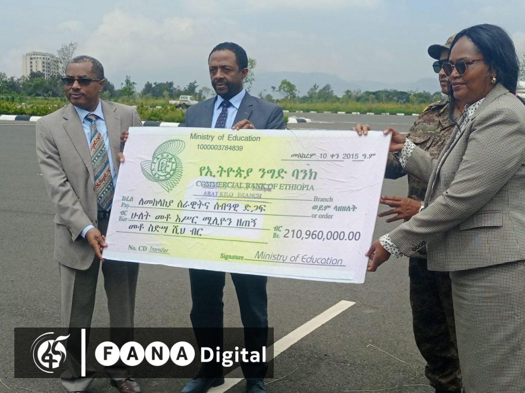 አዲስ አበባ፣ መስከረም 11፣ 2015 (ኤፍ ቢ ሲ) ትምህርት ሚኒስቴር ለመከላከያ ሠራዊት ከ210 ሚሊየን ብር በላይ ጥሬ ገንዘብ እና የንፅህና መጠበቂያ ቁሳቁስ ድጋፍ አድርጓል፡፡