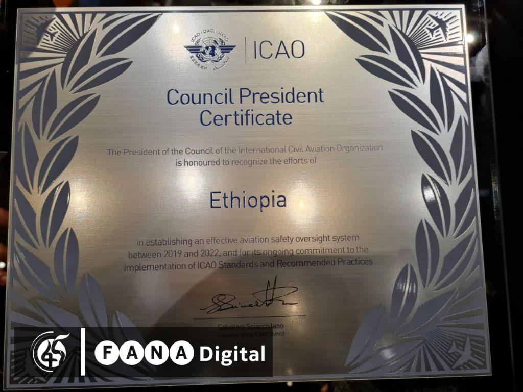 ኢትዮጵያ የምክር ቤቱ ፕሬዚዳንት የምስክር ወረቀት የተበረከተላት ከአባል ሀገራቱ መካከል በዓለም ዓቀፍ የደኅንነት ክትትል ኦዲት ፕሮግራም ላስመዘገበችው ውጤት መሆኑ ተገልጿል፡፡