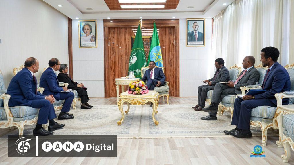 አዲስ አበባ፣ ጥር 10፣ 2015 (ኤፍ ቢ ሲ) ምክትል ጠቅላይ ሚኒስትር እና የውጭ ጉዳይ ሚኒስትር ደመቀ መኮንን ከተመድ ከፍተኛ ተወካይ አምባሳደር ራባብ ፋጢማ ጋር በጽህፈት ቤታቸው ተወያዩ፡፡