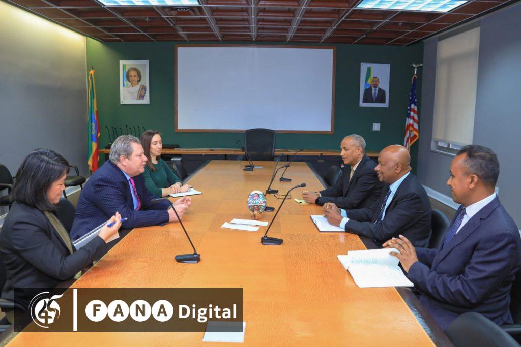 አዲስ አበባ ፣ ጥር 24 ፣ 2015 (ኤፍ ቢ ሲ) በአሜሪካ የኢትዮጵያ አምባሳደር ስለሺ በቀለ ከአሜሪካ የአፍሪካ ቀንድ ልዩ መልዕክተኛ አምባሳደር ማይክ ሀመር እና ከአፍሪካ ጉዳይ ቢሮ ምክትል ሃላፊ አምባሳደር ሞሊ ፊ ጋር ተወያይተዋል፡፡