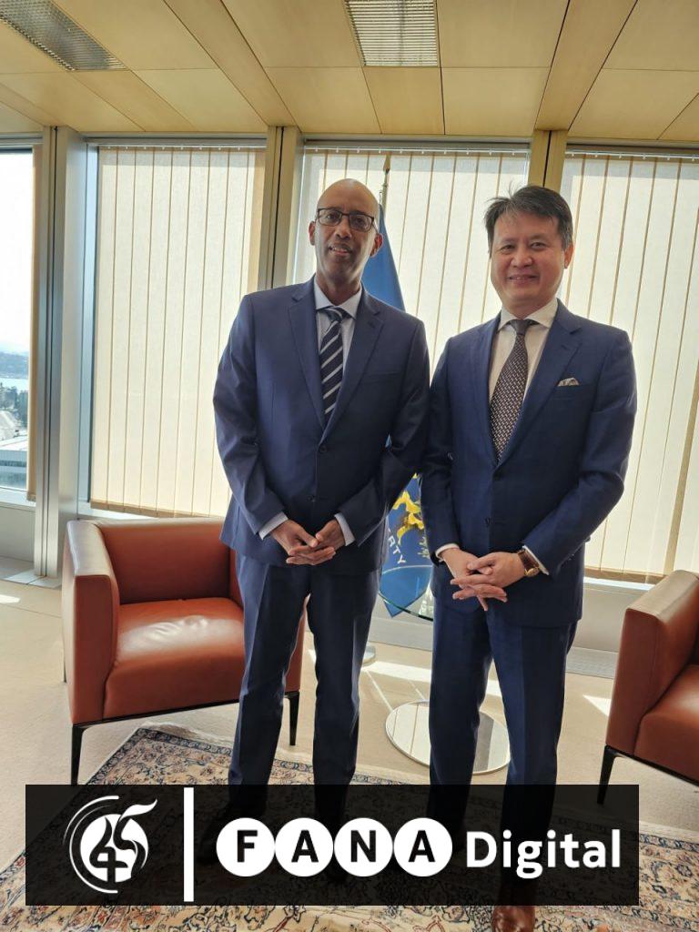 አዲስ አበባ፣ መጋቢት 21፣ 2015 (ኤፍ ቢ ሲ) በጄኔቫ የኢፌዴሪ ቋሚ ተጠሪ አምባሳደር ጸጋአብ ከበበው ከዓለም አቀፉ የአዕምሯዊ ንብረት ድርጅት ዋና ዳይሬክተር ዳረን ታንግ ጋር ተወያይተዋል፡፡