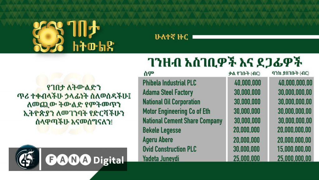 በተጨማሪም በቀለ ለገሰ 20 ሚሊየን፣ አገሩ አበረ 20 ሚሊየን፣ ኦቪድ ኮንስትራክሽን 15 ሚሊየን እንዲሁም ያደታ ጁነይዲ 25 ሚሊየን ብር ድጋፍ ማድረጋቸውን የጠቅላይ ሚኒስትር ጽህፈት ቤት መረጃ ያመላክታል፡፡