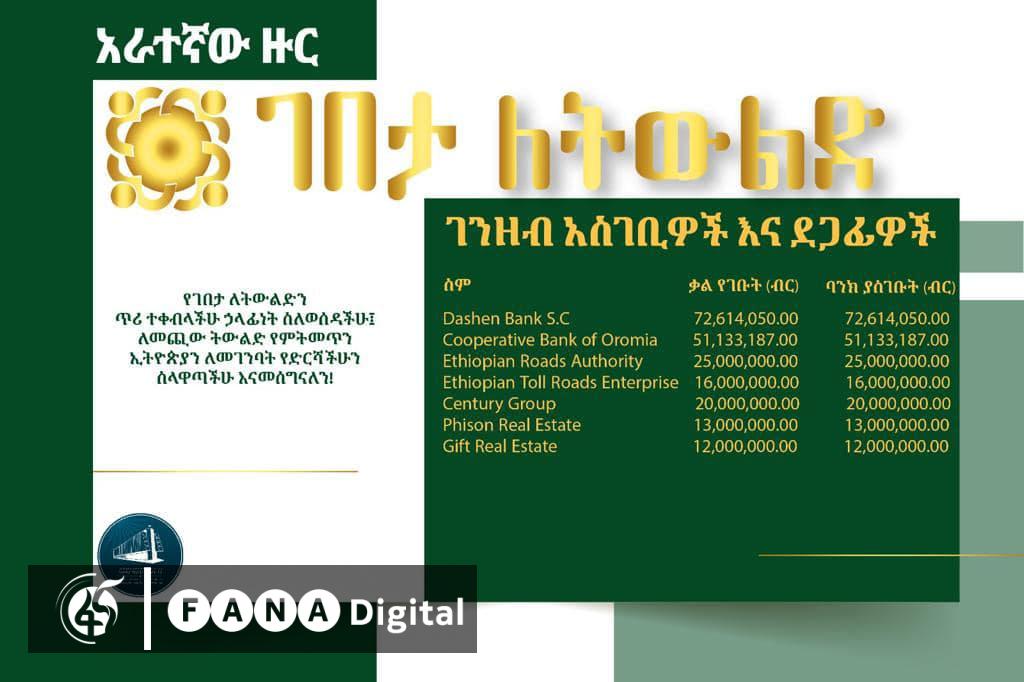 በተጨማሪም ሴንቹሪ ግሩፕ 20 ሚሊየን ብር፣ ፊሰን ሪል ስቴት 13 ሚሊየን ብር እንዲሁም ጊፍት ሪል ስቴት የ12 ሚሊየን ብር ድጋፍ ያደረጉ ድርጅቶች ናቸው፡፡