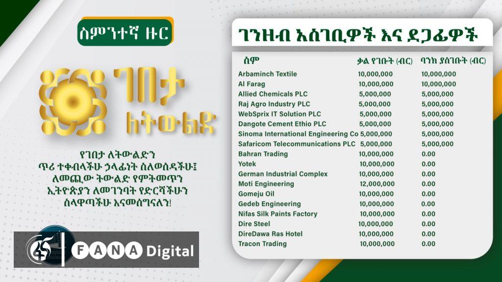 በዚህ መሰረትም አርባ ምንጭ ቴክስታይል፣ አልፋራግ፣ አላይድ ኬሚካልስ ሃላፊነቱ የተወሰነ የግል ኩባንያ፣ ራጅ አግሮ ኢንዱስትሪ ሃላፊነቱ የተወሰነ የግል ኩባንያ፣ ዌብስፕሪክስ አይቲ ሶሉሽን ሃላፊነቱ የተወሰነ የግል ኩባንያ፣ዳንጎቴ ሲሚንቶ ኢትዮጵያ ሃላፊነቱ የተወሰነ የግል ኩባንያና ሲኖማ ኢንተርናሽናል ኢንጅነሪንግ ኮርፖሬሽን ድጋፍ ማድረጋቸው ተገልጿል፡፡