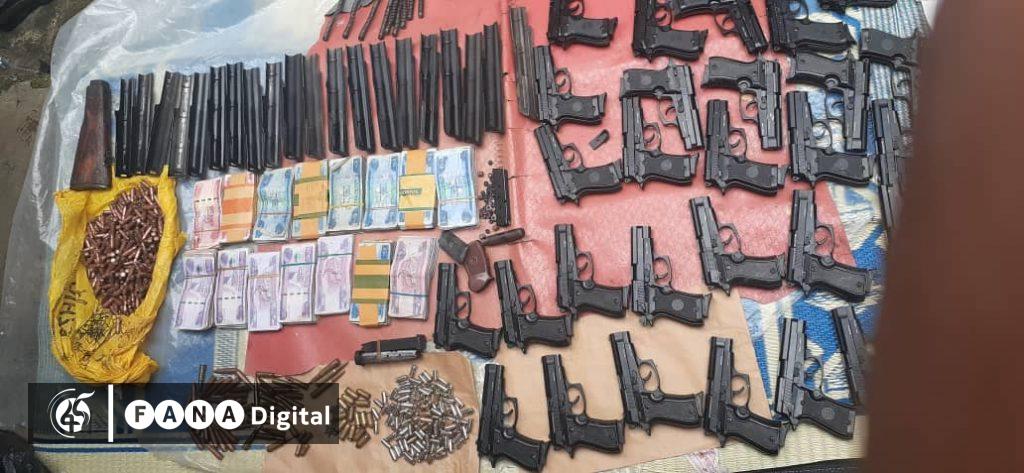 በዚህም በተጠርጣሪው መኖሪያ ቤት 64 የተለያዩ ዓይነት ሽጉጦች ፣ 587 የሽጉጥና የክላሽንኮቭ ጥይቶች እንዲሁም የኢትዮጵያ ብሔራዊ ባንክን መመሪያ በመጣስ 197 ሺህ 400 ብር አስቀምጦ በመገኘቱ በቁጥጥር ሥር ውሎ ምርመራው እየተደረገ መሆኑ መገለፁን ከፌደራል ፖሊስ ያገኘነው መረጃ ያመላክታል።