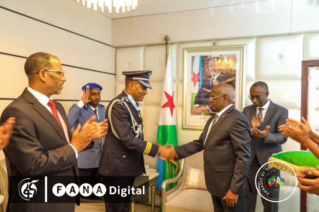 የፌደራል ፖሊስ ኮሚሽነር፤ የወቅቱ የምስራቅ አፍሪካ ፖሊስ አዛዦች ህብረት ድርጅት ፕሬዚዳንት ጀነራል ደመላሽ ገ/ሚካኤል ከጅቡቲ ጠቅላይ ሚኒስትር አብዱልቃድር ካሚል መሀመድ የፖሊስ የክብር ኒሻኑን ተቀብለዋል።