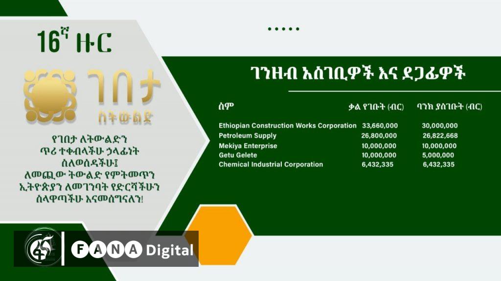 በ16ኛው ዙር የተለያዩ ተቋማት ከ76 ሚሊየን ብር በላይ ለገበታ ለትውልድ ድጋፍ ማድረጋቸውን የጠቅላይ ሚኒስትር ፅህፈት ቤት መረጃ ያመላክታል።