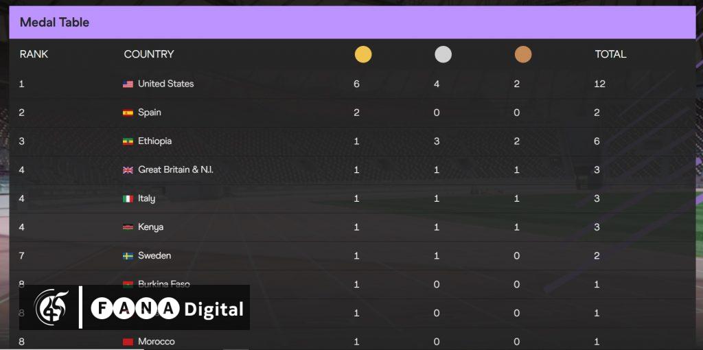 በሜዳሊያ ሰንጠረዡ÷ ኢትዮጵያ 1 የወርቅ፣ 3 የብር እንዲሁም 2 የነሐስ ሜዳሊያዎችን በመሰብሰብ ከዓለም በሦስተኛ ደረጃ ላይ ትገኛለች፡፡