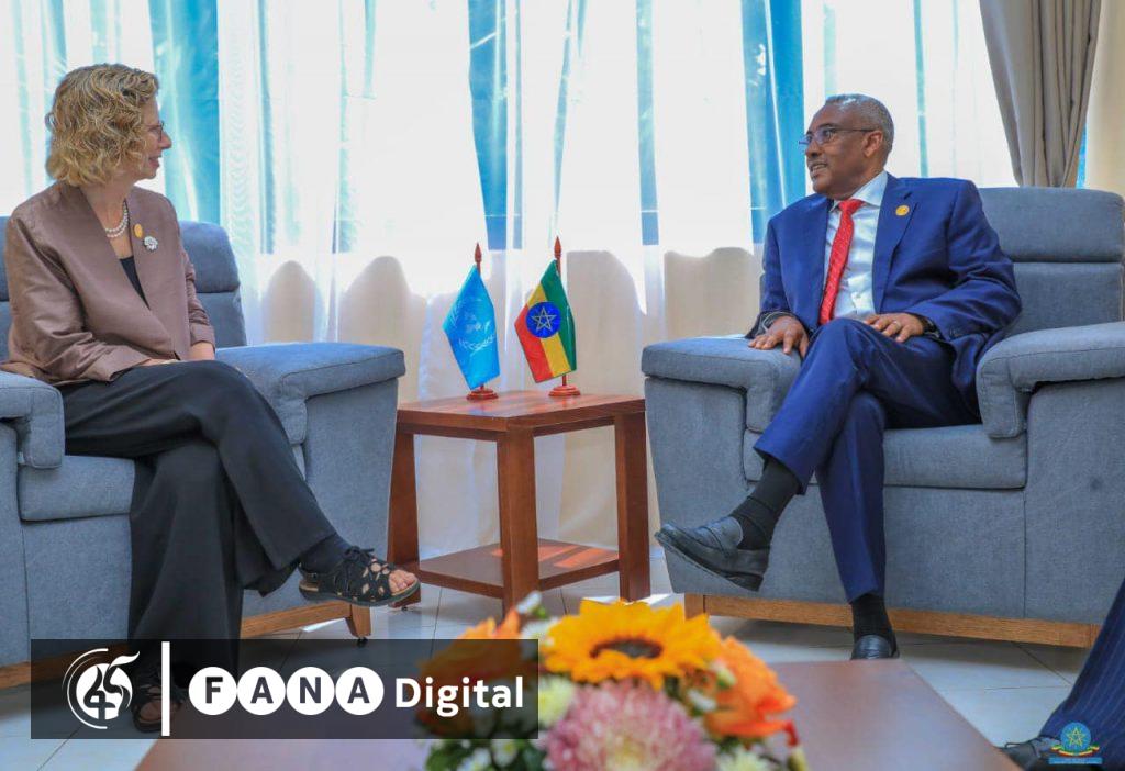 አዲስ አበባ ፣ መስከረም 4 ፣ 2016 (ኤፍ ቢ ሲ) ምክትል ጠቅላይ ሚኒስትር እና የውጭ ጉዳይ ሚኒስትር ደመቀ መኮንን ከተመድ የአየር ንብረት ፕሮግራም ዋና ዳይሬክተር ኢንገር አንደርሰን ጋር ተወያዩ።