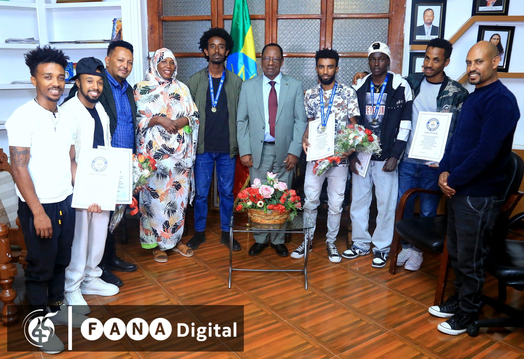 የባህልና ስፖርት ሚኒስትር ቀጄላ መርዳሳ÷ የዓለምን ክብረ ወሰን በመስበር የኢትዮጵያን ሰንደቅ ዓላማ በዓለም መድረክ ከፍ ላደረጉት ብላክ ላየን የሰርከስ ቡድን አባላት አቀባበል አድርገዋል፡፡