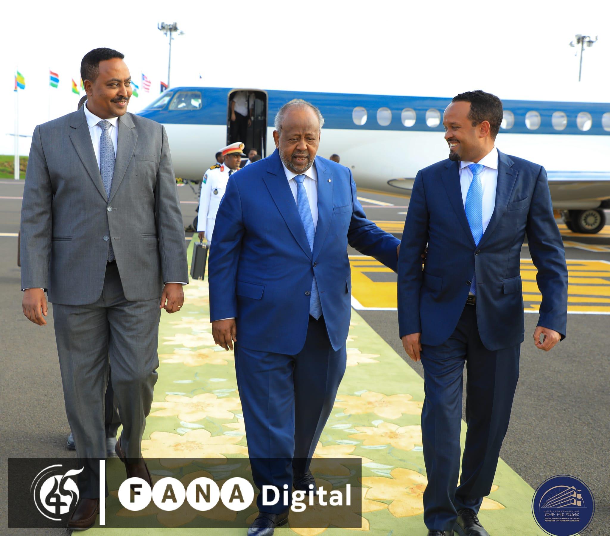 የጅቡቲ ፕሬዚዳንት ቦሌ ዓለም አቀፍ አውሮፕላን ማረፊያ ሲደርሱ የገንዘብ ሚኒስትር አህመድ ሺዴ አቀባበል አድርገውላቸዋል።