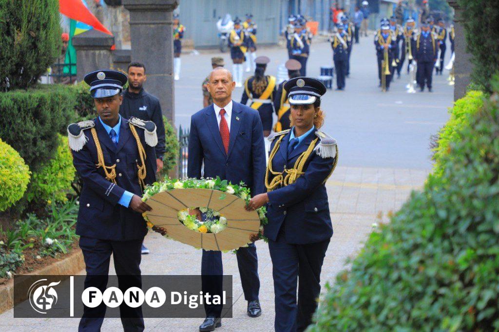 የአበባ ጉንጉኑን ያስቀመጡት÷ የፌደሬሽን ምክር ቤት ዋና አፈጉባዔ አገኘሁ ተሻገር፣ የጦር ኃይሎች ጠቅላይ ኢታማዦር ሹም ወታደራዊ አማካሪና የተኩስ አመራር ኃላፊ ሌተናል ጀነራል አለምሸት ደግፌ፣ የፌዴራል ፖሊስ ምክትል ኮሚሽነር ጄነራል ዘላለም መንግስቴ እና የጥንታዊት ኢትዮጵያ ጀግኖች ዓርበኞች ማኅበር ፕሬዚዳንት ልጅ ዳንኤል ጆቴ መስፍን ናቸው፡፡