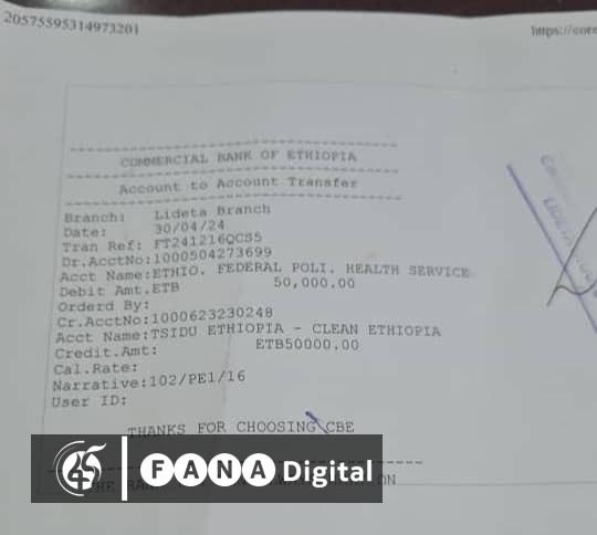 የኢትዮጵያ ፌደራል ፖሊስ በጠቅላይ ሚኒስትር ዐቢይ አሕመድ (ዶ/ር) ይፋ ተደርጎ “ጽዱ ጎዳና – ኑሮ በጤና” በሚል መሪ ሀሳብ እየተካሄደ ያለውን የጽዱ ኢትዮጵያ ንቅናቄን በመደገፍ 50 ሺህ ብር ገቢ አድርጓል።