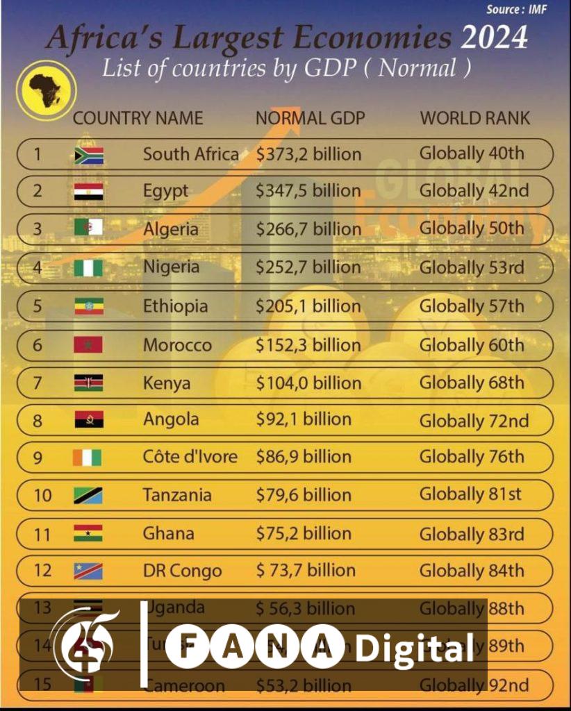 ደቡብ አፍሪካ ፣ግብፅ፣አልጄሪያ እና ናይጄሪያ ደግሞ በአፍሪካ ትልቅ ኢኮኖሚ ካላቸው ሀገራት ከአንድ እስከ አራተኛ ደረጃን የያዙ ሀገራት ናቸው፡፡