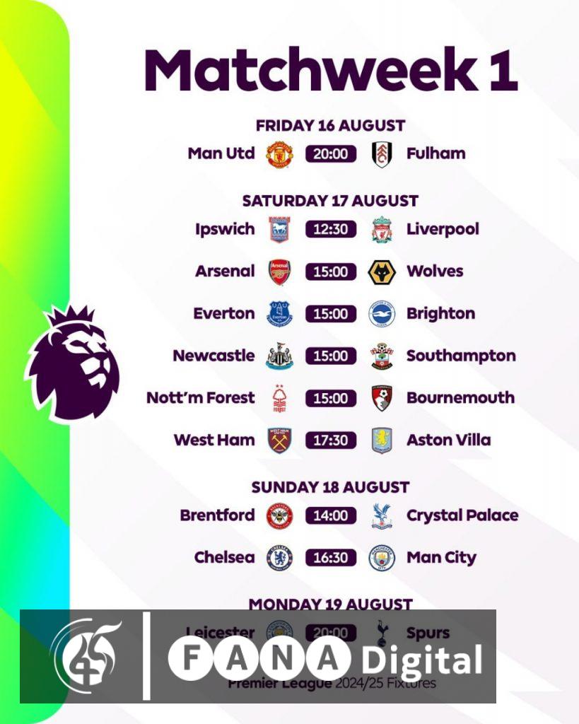በዚሁ መሠረት የ2024/25 የእንግሊዝ ፕሪሚየር ሊግ በፈረንጆቹ ነሐሴ 16 ቀን 2024 ማንቼስተር ዩናይትድ ከፉልሃም በሚያደርጉት ጨዋታ የሚጀመር ይሆናል፡፡
