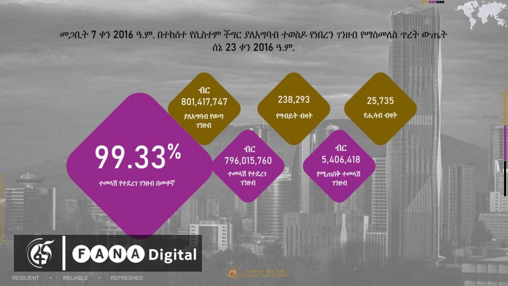 በወቅቱ ያለአግባብ ተወስዶ ከነበረው 801 ነጥብ 4 ሚሊየን ብር 796 ነጥብ 02 ሚሊየን መመለሱን የባንኩ መረጃ አመላክቷል፡፡