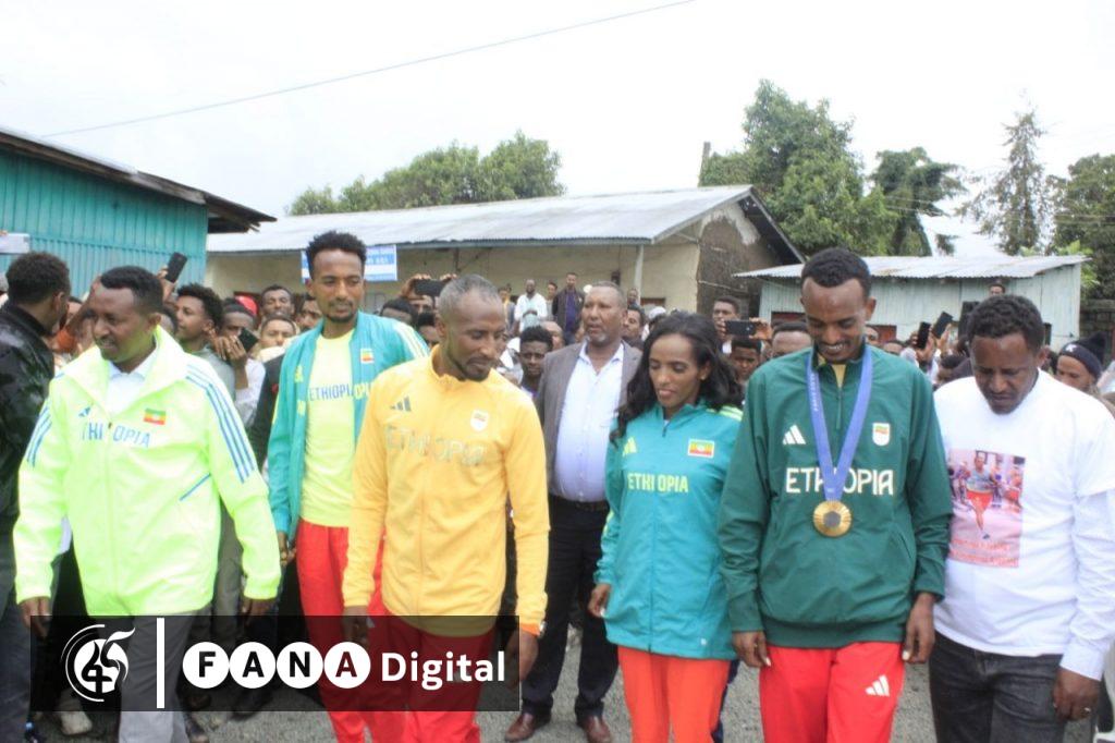 አትሌቱ በከተማው ሲደርስ የአካባቢው ማህበረሰብ፣ የወረዳው አመራሮችና የአትሌቱ ቤተሰቦች የጀግና አቀባበል አድርገውለታል።