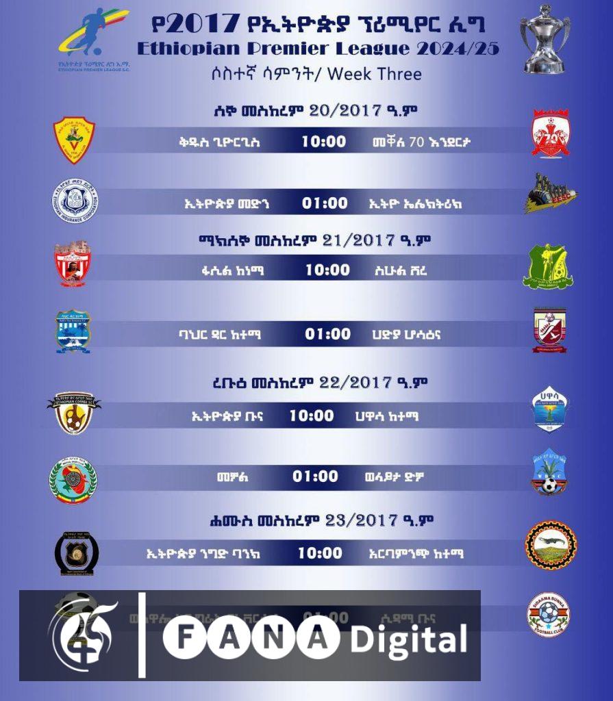 አዲስ አበባ፣ መስከረም 20፣ 2017 (ኤፍ ቢ ሲ) በኢትዮጵያ ፕሪሚየር ሊግ የሦስተኛ ሳምንት መርሐ-ግብር ዛሬ በሚደረጉ ሁለት ጨዋታዎች ይጀመራል።