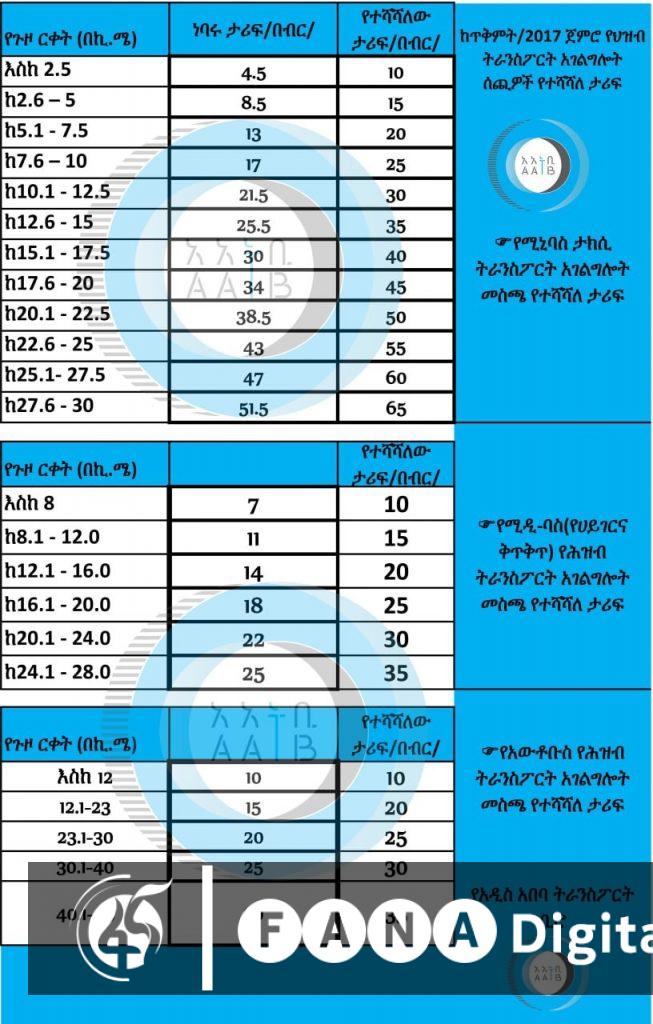 አዲስ አበባ፣ ጥቅምት 5፣ 2017 (ኤፍ ቢ ሲ)የአዲስ አበባ ከተማ አስተዳደር ትራንስፖርት ቢሮ የሕዝብ ትራንስፖርት አገልግሎት ላይ ለተሰማሩ ሚኒ-ባሶች፣ ሚዲ-ባስ ታክሲዎችና የከተማ አውቶብሶች ላይ የአገልግሎት ታሪፍ ማሻሻያ አድርጓል፡፡