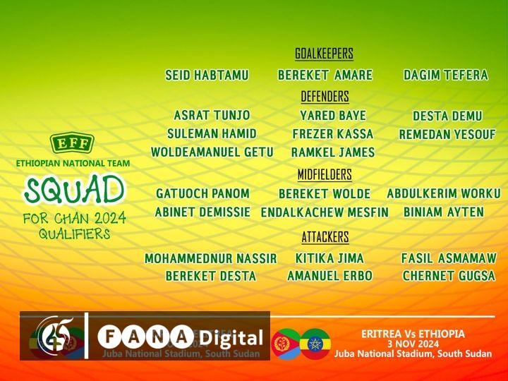 አዲስ አበባ፣ ጥቅምት 13፣ 2017 (ኤፍ ቢ ሲ) የኢትዮጵያ ብሔራዊ ቡድን ከኤርትራ ጋር ጥቅምት 21 እና 24 ቀን 2017 ዓ.ም ለሚያደርገው የቻን ማጣሪያ ደርሶ መልስ ጨዋታ ለ23 ተጨዋቾች ጥሪ ቀረበ፡፡